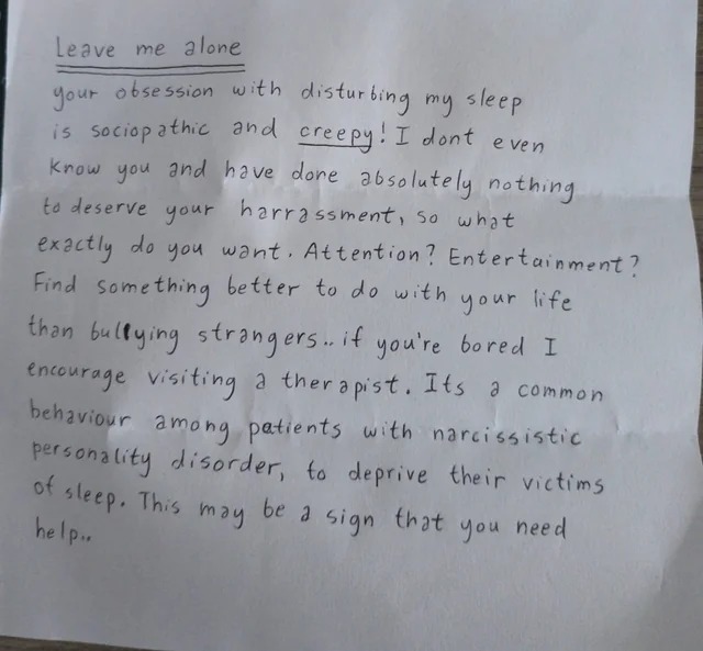 context: I just moved into a new apartment on the 4th floor and the person below me left this note, they already left me another note the day after I moved in that was much nicer just telling me that the building was badly built and to please walk quietly If I can, but I find this pretty concerning.