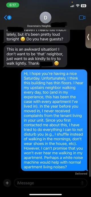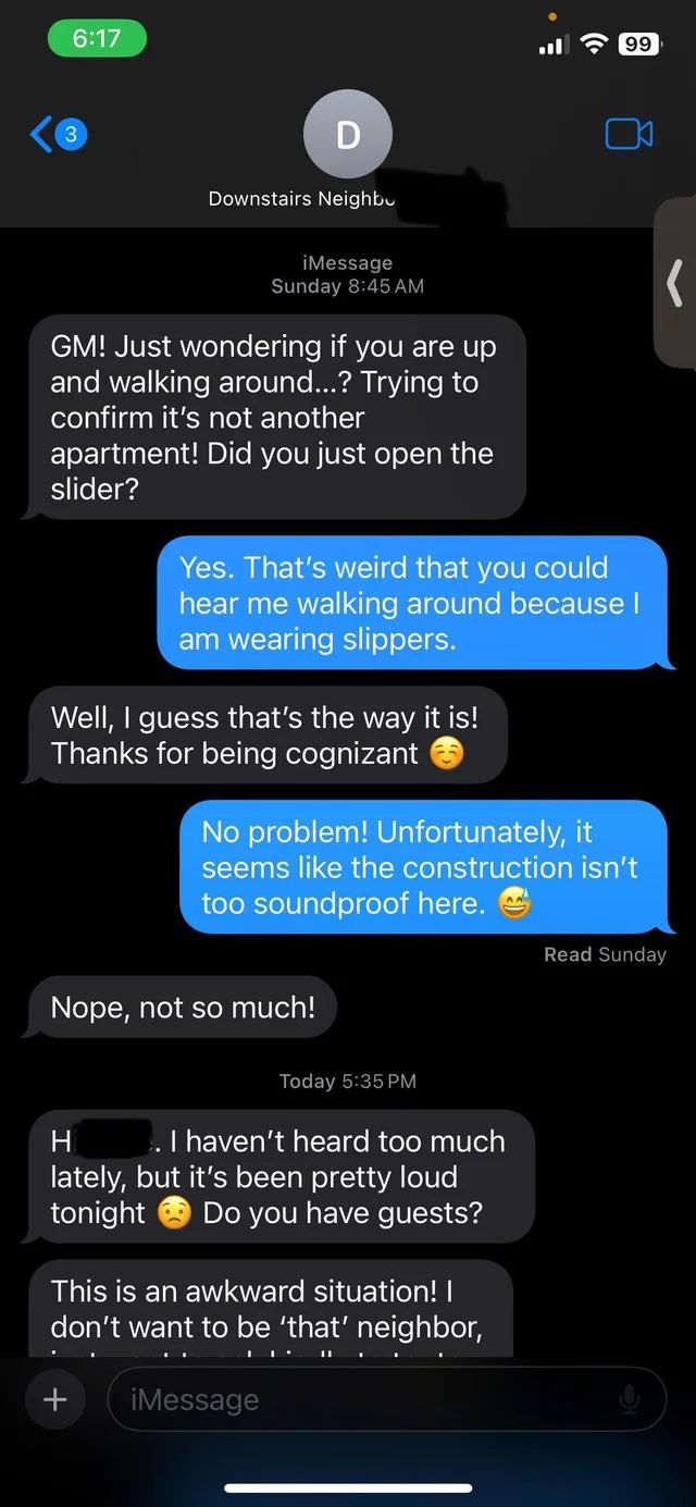 My downstairs neighbor is texting me every time I walk into the apartment. What do I do? I’m a small woman and never have parties.