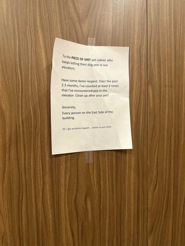 Someone constantly lets their dog pee in the elevator and never cleans it up. This is a β€œluxury” apartment in name and price only. The complex cleans the elevators once a day and has sent emails threatening to review cameras to find the culprit. Obviously, they have not and everyone is fed up about it. This morning, I walked into the elevator and saw this. Bravo, brave stranger!
