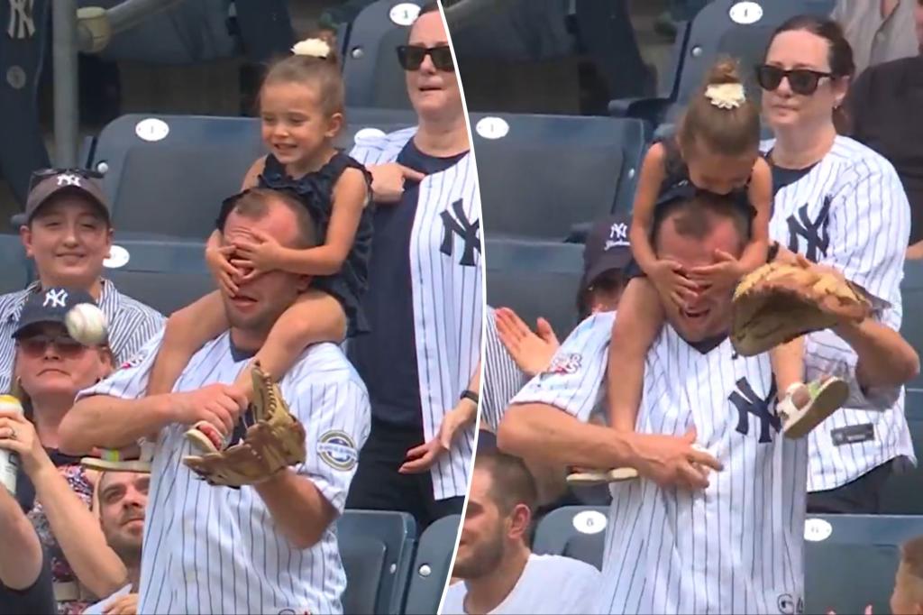 Dad makes wild catch on foul ball while daughter covers his eyes at Yankees game