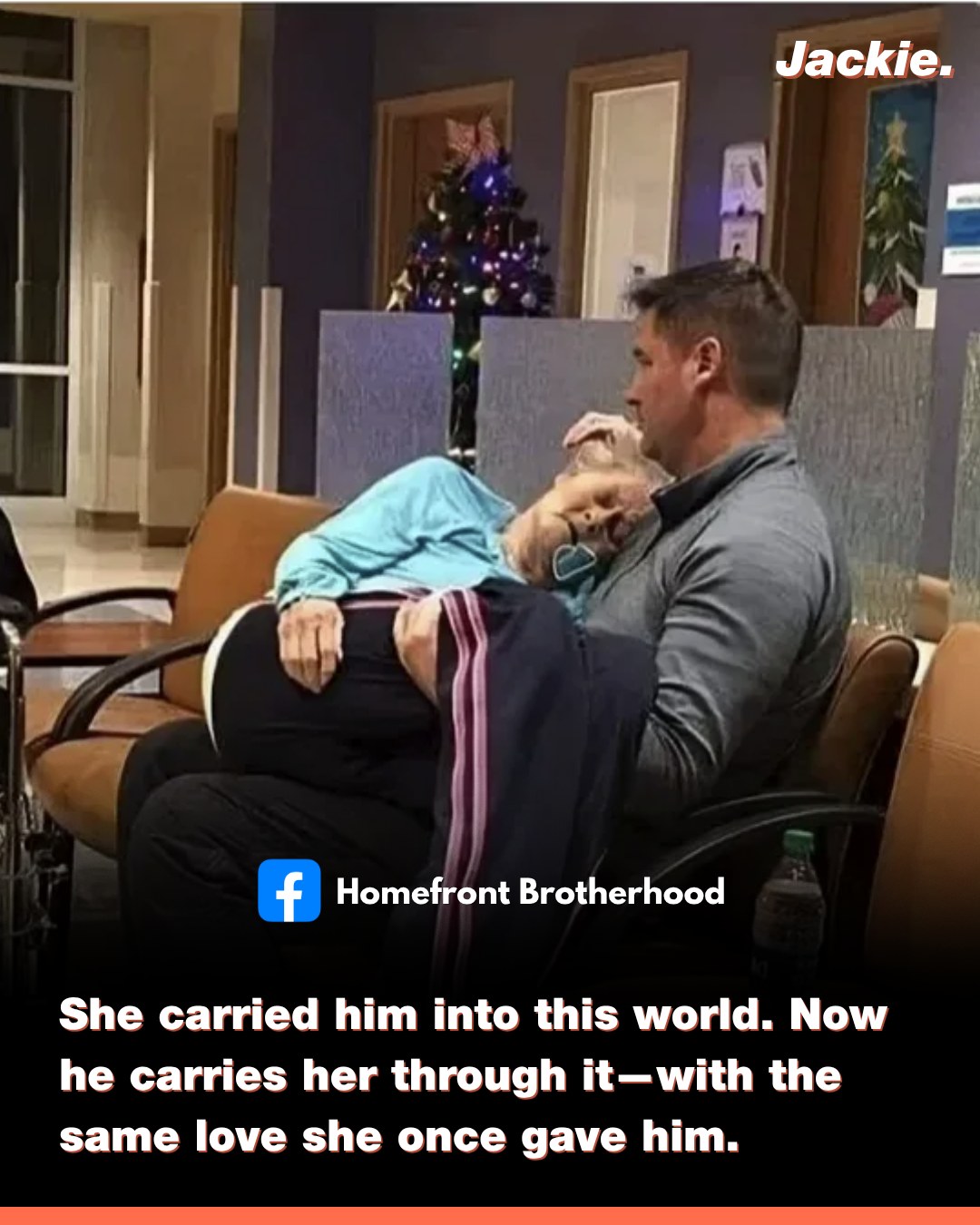 It’s a perfect reminder of life’s beautiful circle: the love we receive, we eventually learn to give back. She once held him through everything. Now he holds her.