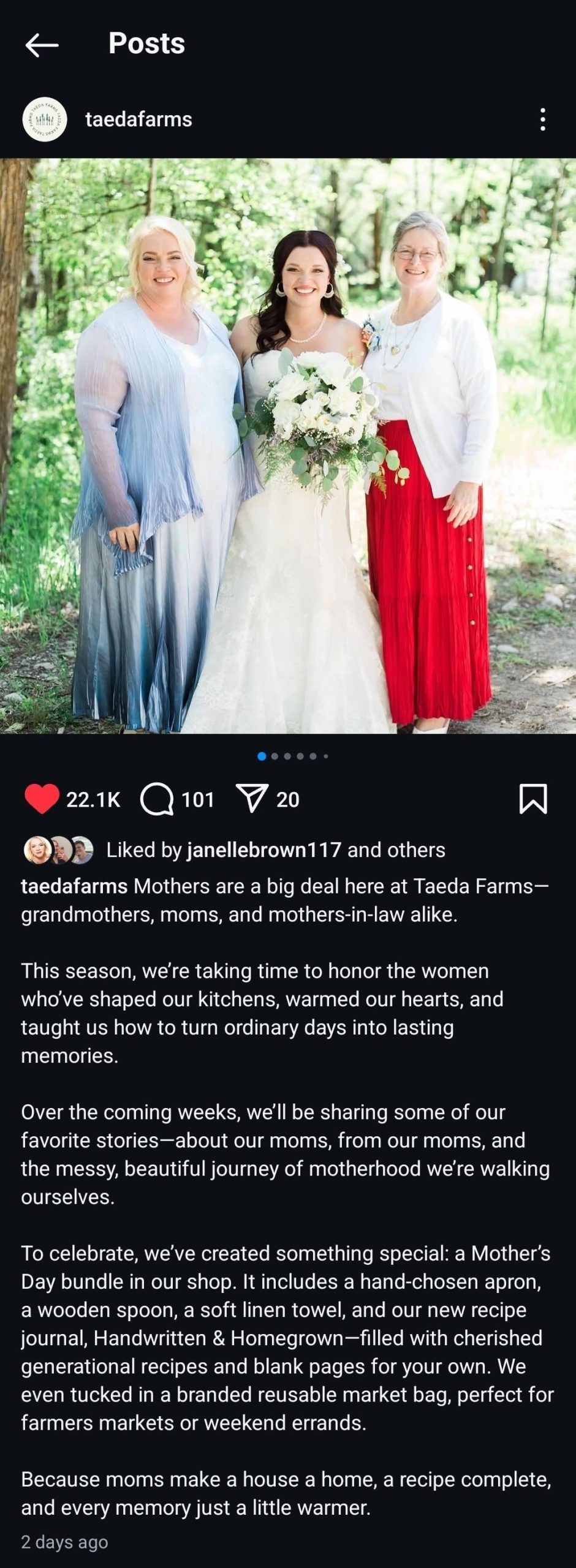 Taeda Farm and Janelle Says already appear to be very successful as far as merchandise sales go. But I really like what they did with their Mother's Day products and advertising for it. Even if they weren't famous, creating a personal connection with the customer with blogs, stories, and pictures can create longterm loyalty and sales.