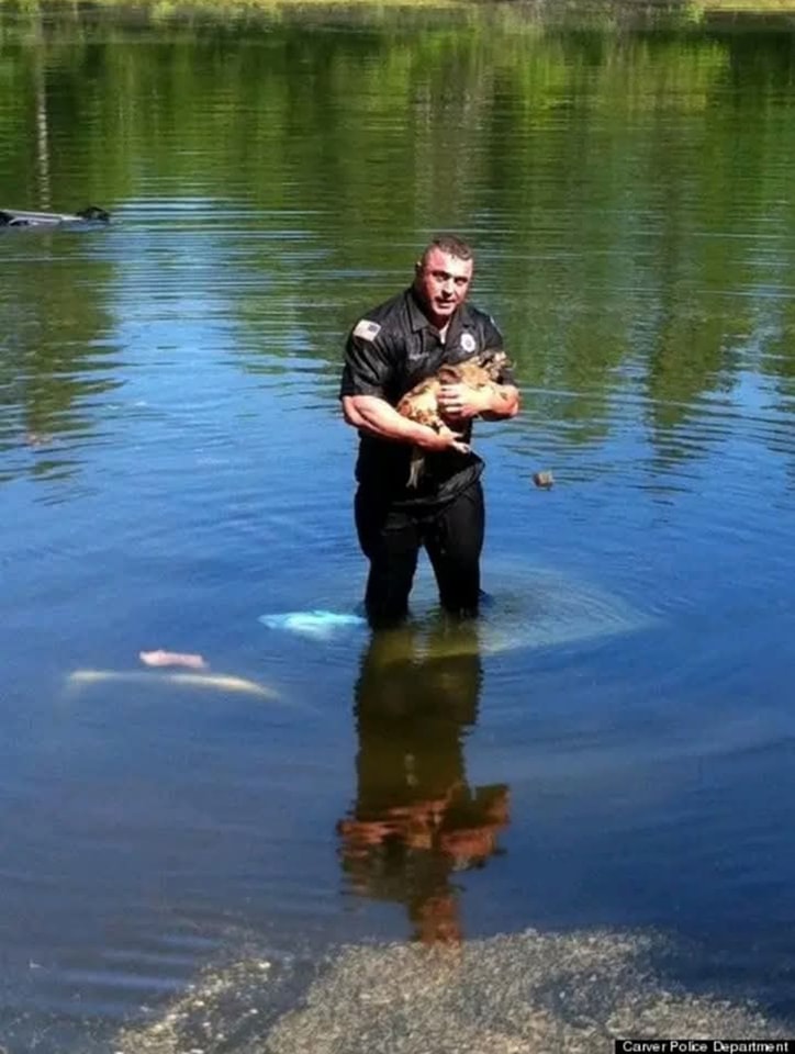 So Officer Harriman dove in, swam to the bottom and worked to save the dog! He’s a total hero! Give him a thumbs up!!!
