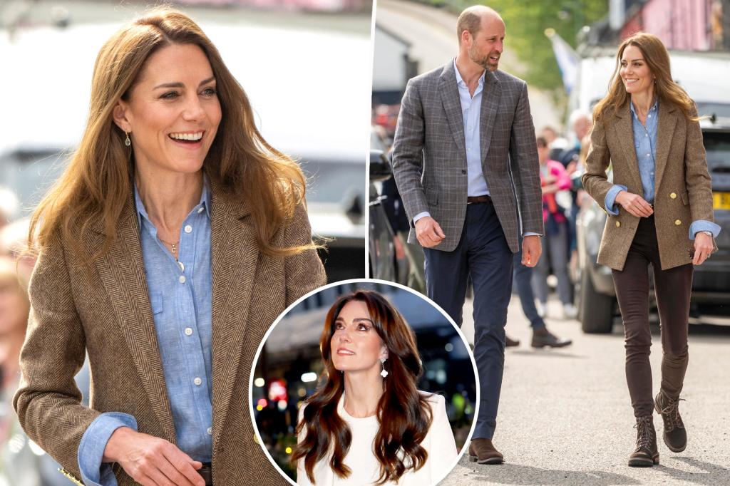 Catherine donned a Holland Cooper blazer, brown skinny jeans, a blue linen button down shirt and brown boots as she began the Scottish tour, The Mirror reported. The Princess of Wales also wore a Cartier watch, thought to have been a third wedding anniversary gift from Prince William, and two necklaces, one of which was adorned with charms for the first initials of her children (George, 11, Charlotte, 9, and Louis, 7), the outlet added.